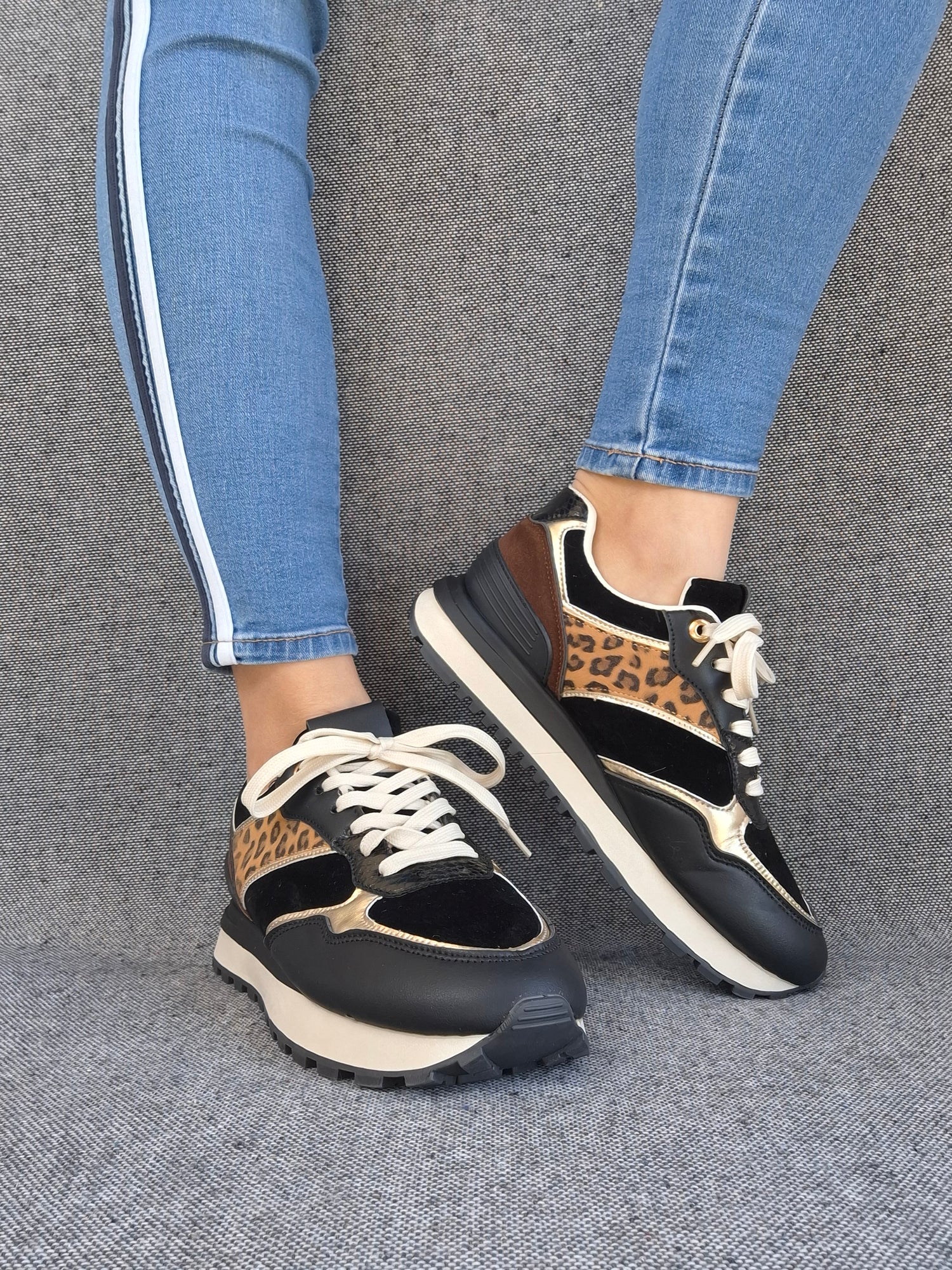 Chaussure baskets basses légèrement compensées noir léopard doré style sneakers