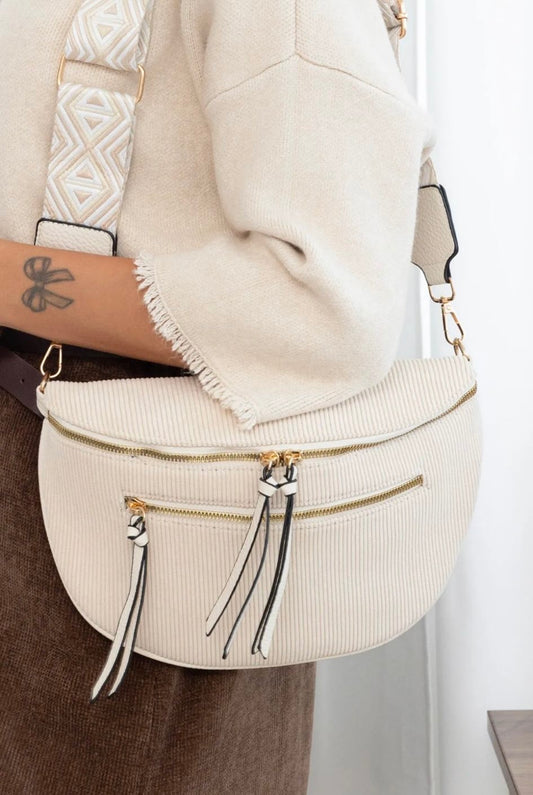 Sac banane beige écru femme en velours côtelé – double poche zippée – sangle fantaisie ajustable