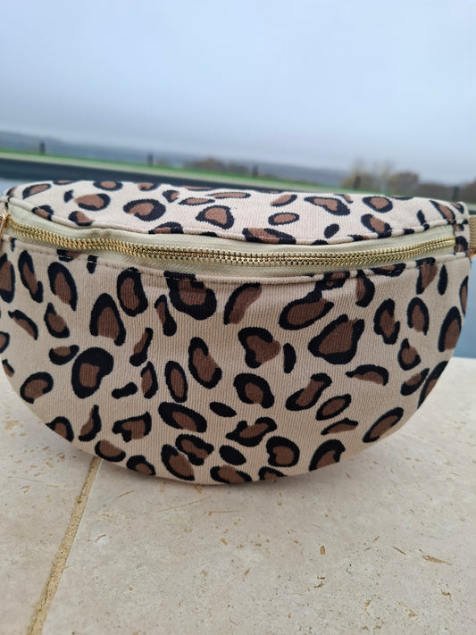 Sac banane en velours côtelé beige imprimé léopard marron et noir