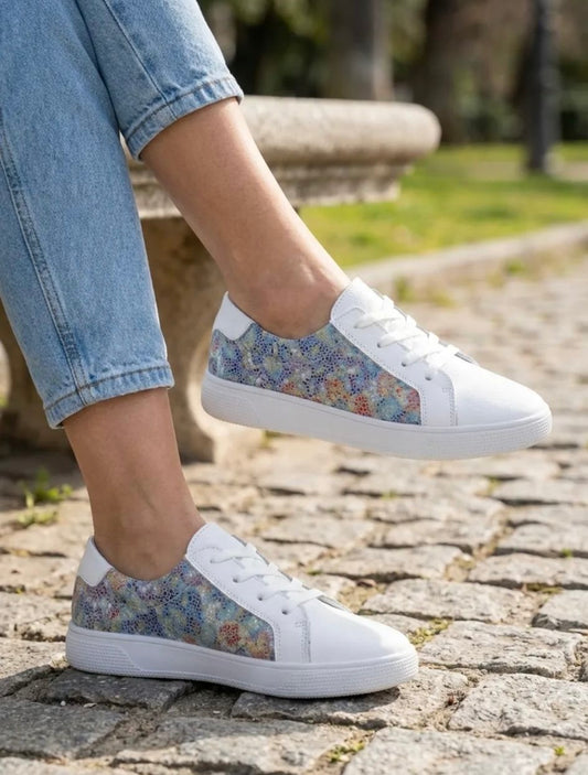 Chaussures baskets basses en cuir blanche imprimé floral multicolore dans des tons pastel