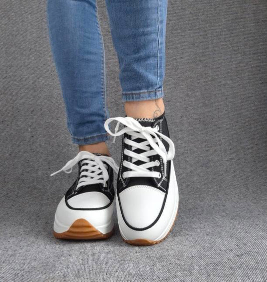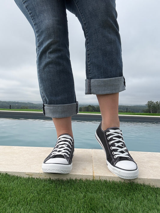 Chaussures baskets basses plates noires avec deux bandes blanches