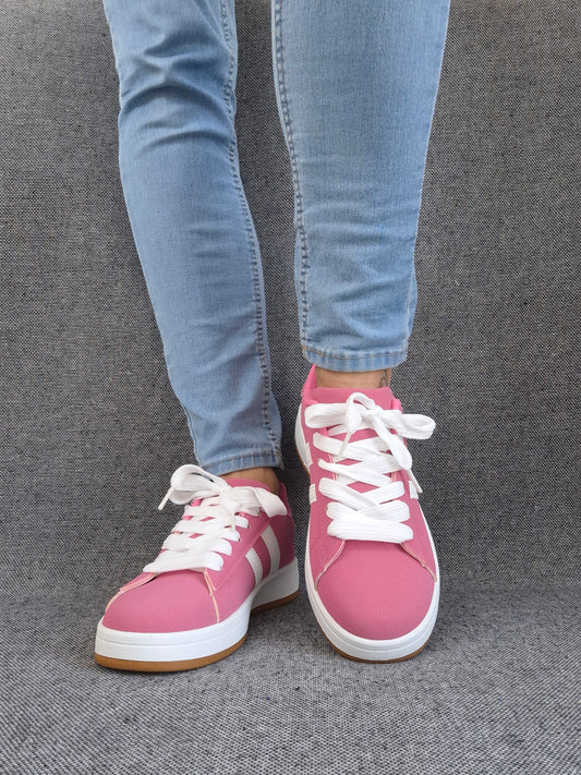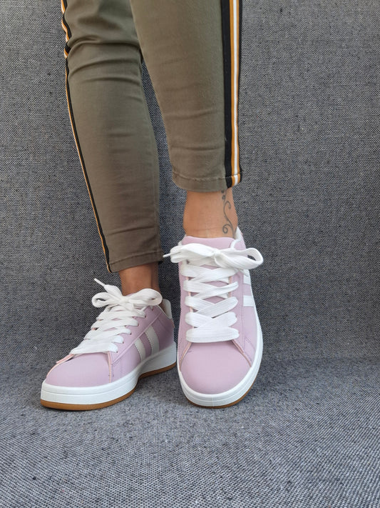 Chaussures baskets basses rose pale lilas avec bandes blanches style sneakers campus
