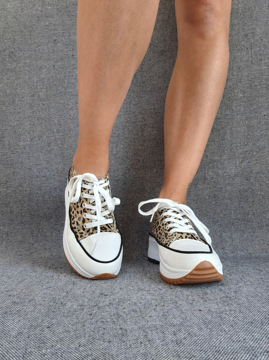 Chaussures baskets basses plate-forme tissu toile motif léopard