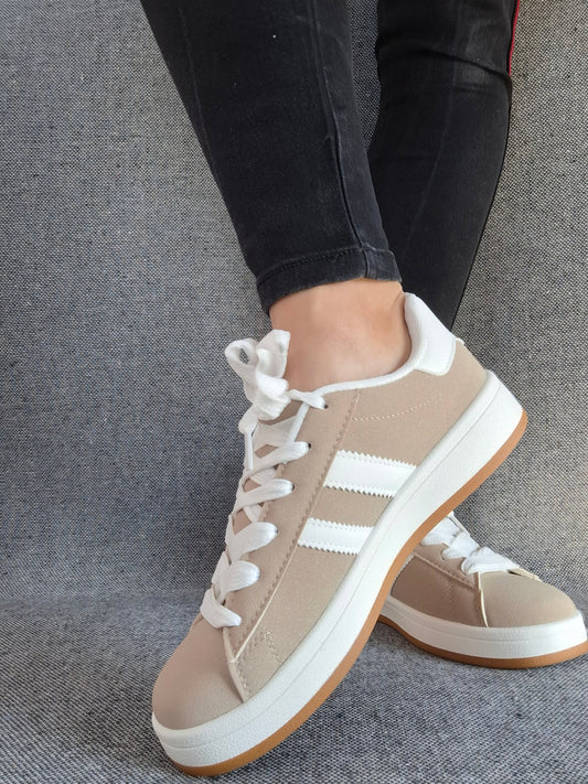 Chaussures baskets basses taupe avec bandes blanches style campus