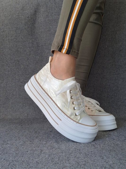 Chaussures baskets basses semelle compensée tissu rigide beige irisé avec motifs zebré style converse plateforme