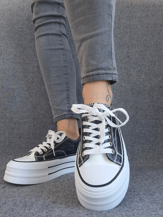 Chaussures baskets basses semelle compensée tissu rigide motif zébrés noir et blanc style converse plateforme