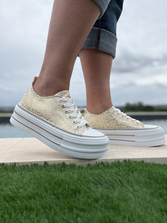 Chaussures baskets basses semelle compensée tissu rigide doré avec motifs zebré style converse plateforme