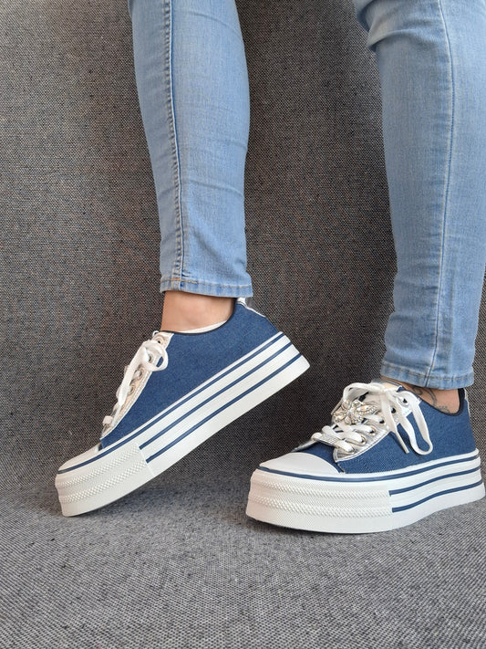 Chaussures baskets basses semelle compensée simili bleu effet jean et blanc style converse