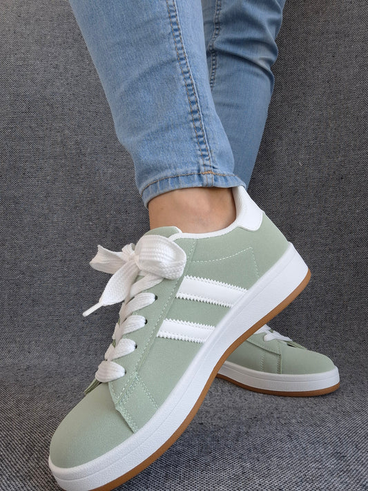 Chaussures baskets basses vert d’eau avec bandes blanches style campus
