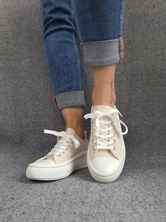 Chaussures baskets en toile beige clair semelle compensée style converse