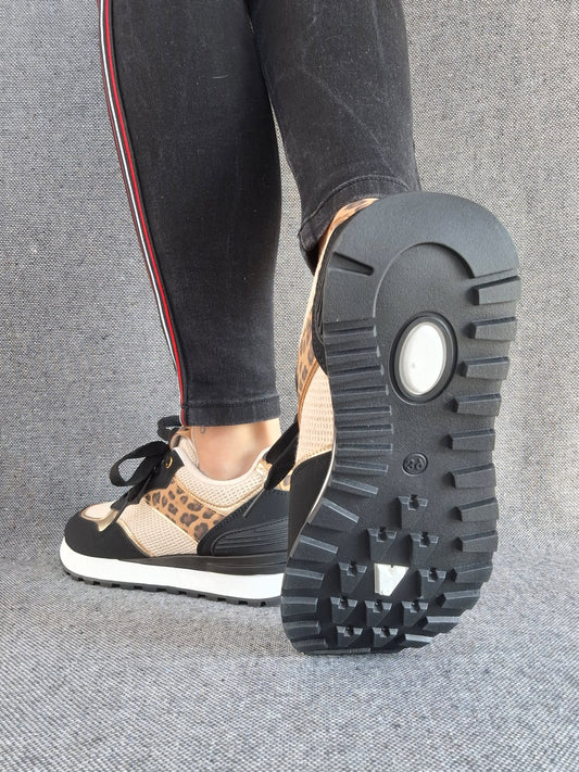 Chaussures baskets en tissu beige et noir avec un motif léopard style sneakers