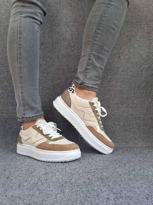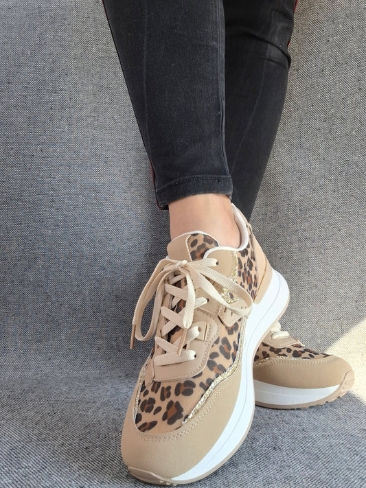 Chaussures baskets en tissu beige léopard avec une bande argentée pailletée style sneakers