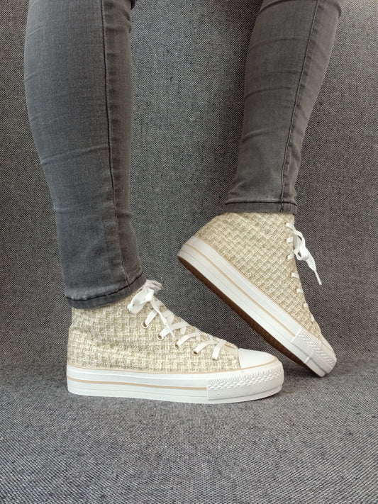 Chaussures baskets hautes en tissu style tressé beige brillant style converse