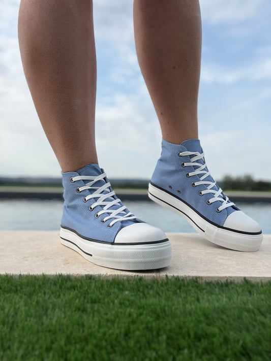 Chaussures baskets hautes en toile bleu clair blanc style converse
