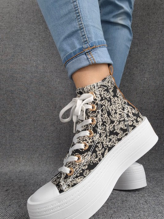 Chaussures baskets hautes en tissu toile noir toile de jouy beige semelles compensées