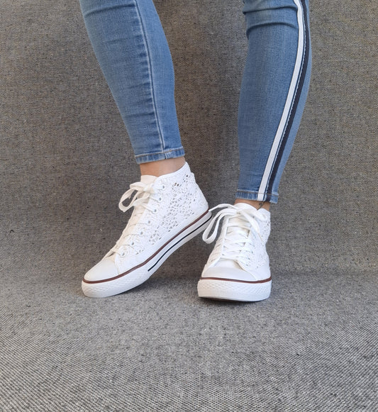 Chaussures baskets hautes à dentelle blanche en tissu style converse