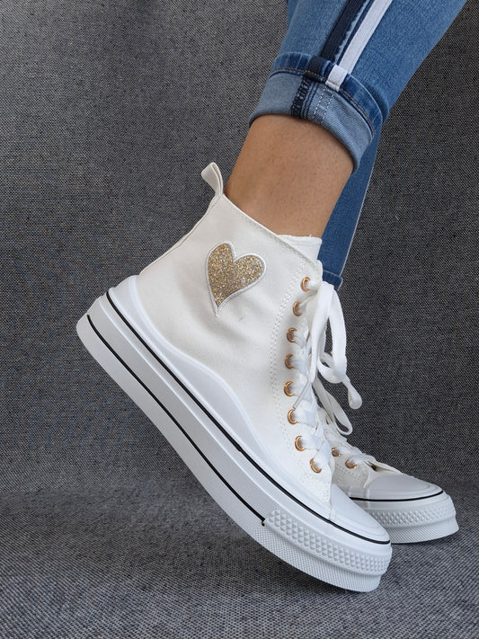 Chaussures baskets hautes blanche avec motif coeur doré style converse