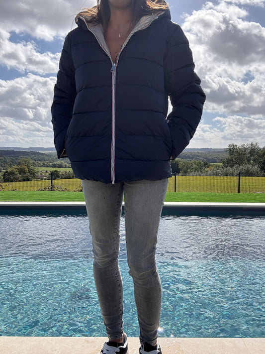 Doudoune manteau imperméable court réversible matelassé bleu marine doré