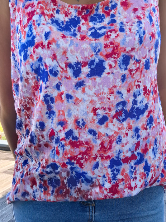 Débardeur fleuri bleu et rouge upcyclé en coton/lin