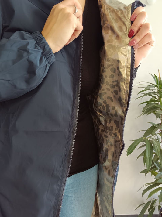 Melya Melody - Manteau long mi cuisses réversible et imperméable léger bleu marine doré léopard
