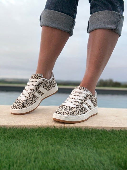 Chaussures baskets basses motif léopard basse en tissu beige style campus