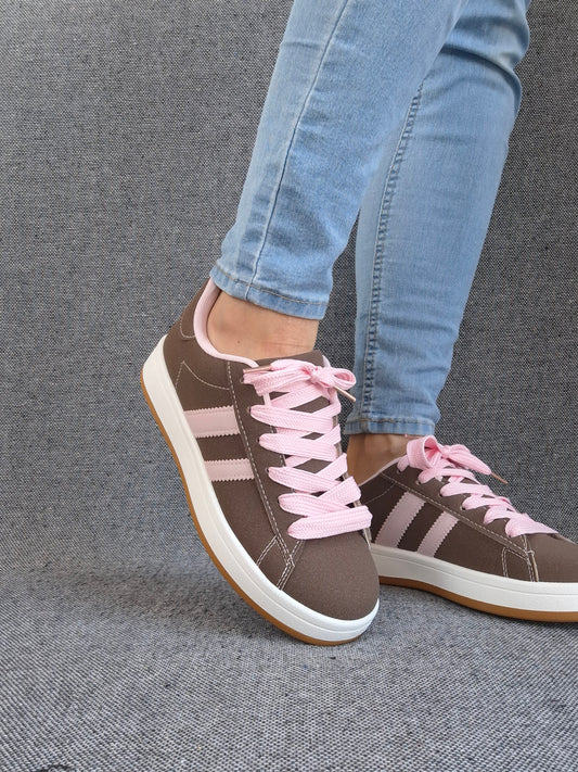 Chaussures baskets basses marrons avec bandes rose style campus