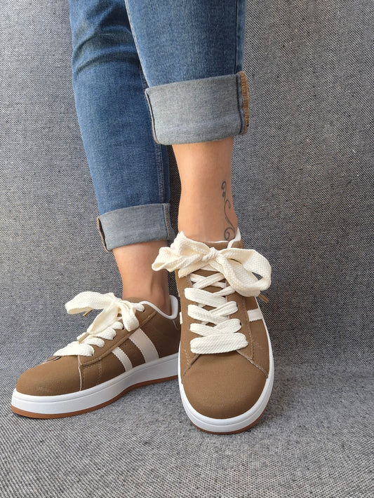 Chaussures baskets basses kaki marron à bandes blanches style campus