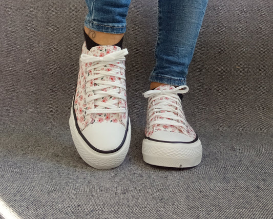 Chaussures baskets basses motifs liberty fleurs roses en tissu style converse