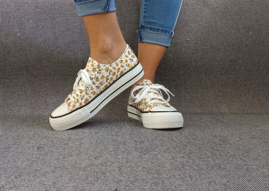 Chaussures baskets basses motifs liberty fleurs jaunes en tissu style converse