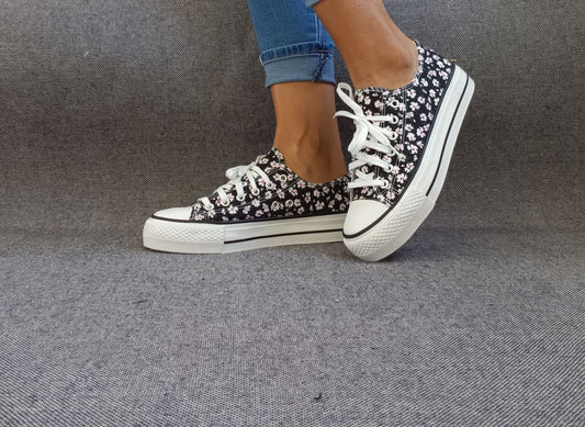 Chaussures baskets basses motifs liberty fleurs noires en tissu type converse