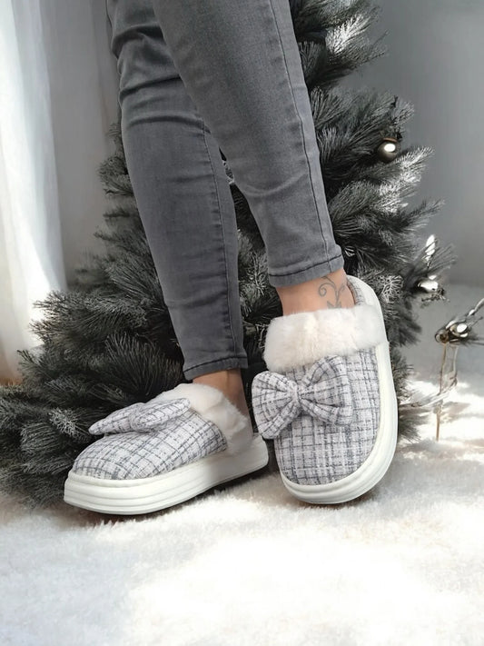 Chaussons fourrés beige et blanc en tissu à carreaux avec noeud