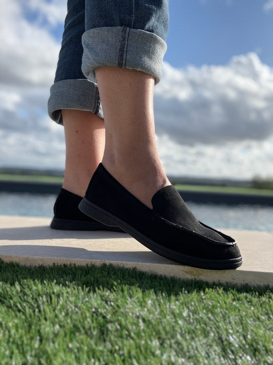 Chaussures mocassins noirs toucher daim avec détails dorés