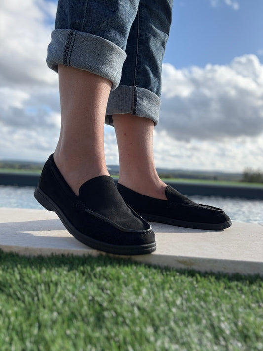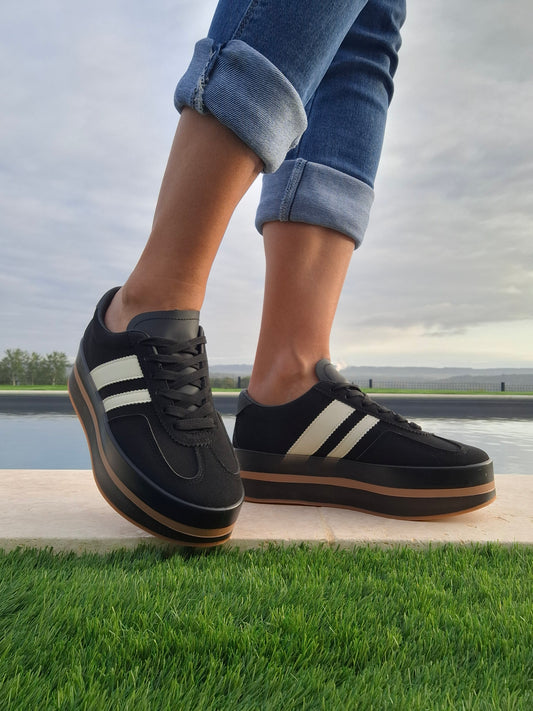 Chaussures baskets basses compensées noir avec bandes blanches style sneakers campus