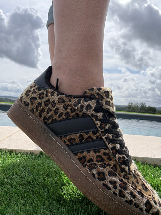 Chaussures baskets basses toucher poils imprimé léopard avec bandes noires style campus