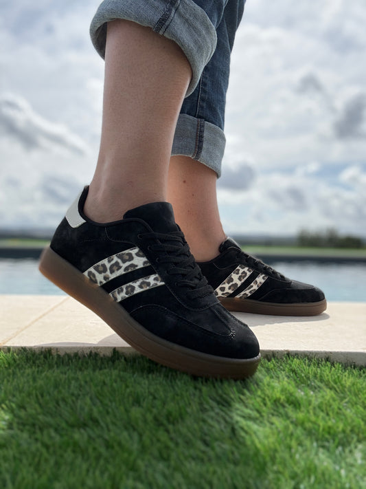 Chaussures baskets basses toucher daim noir avec bandes léopard style campus