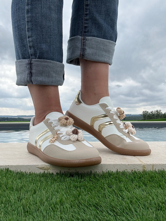 Chaussures baskets plates beige et blanches avec deux bandes dorées