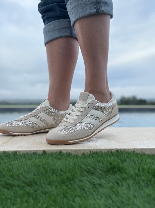Chaussures baskets basses gris pailleté avec des rayures blanches style sneakers