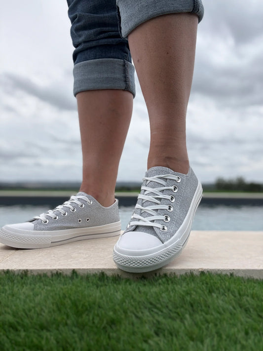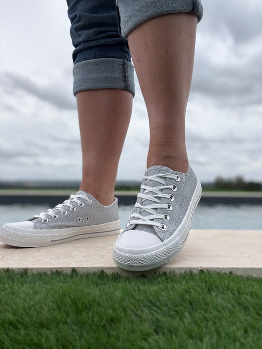 Chaussures baskets basses effet pailleté glitter argenté style converse