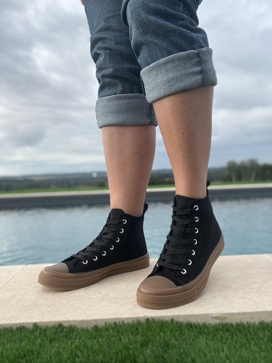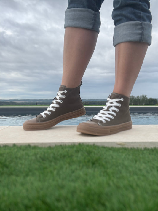 Chaussures baskets hautes en tissu kaki et marron style converse
