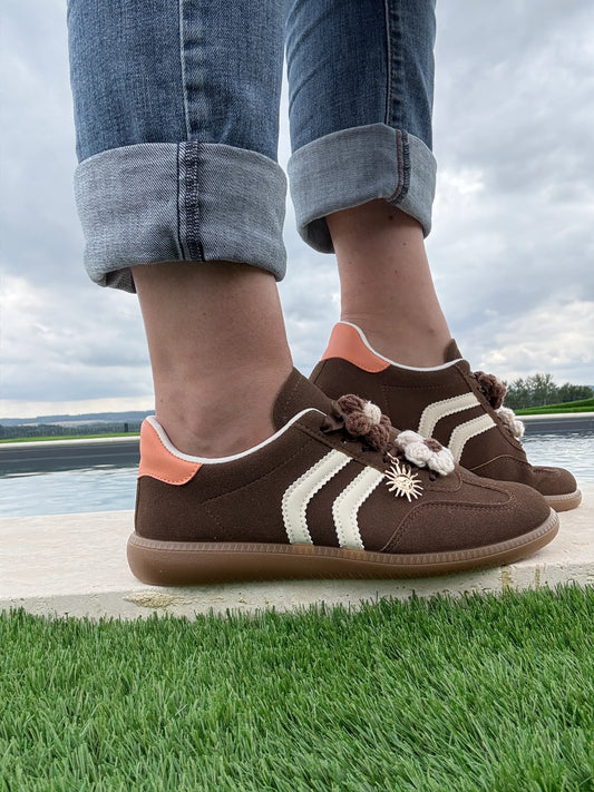 Chaussures baskets plates marron avec deux bandes blanches (bijoux de lacets)