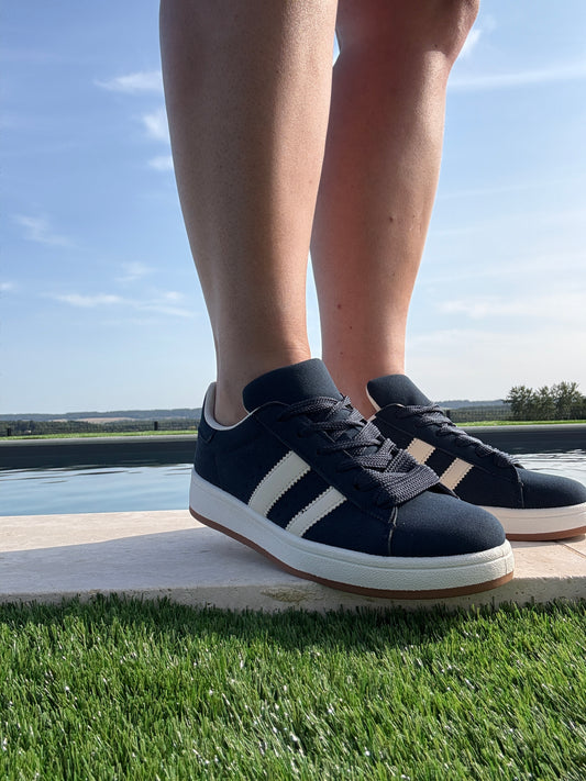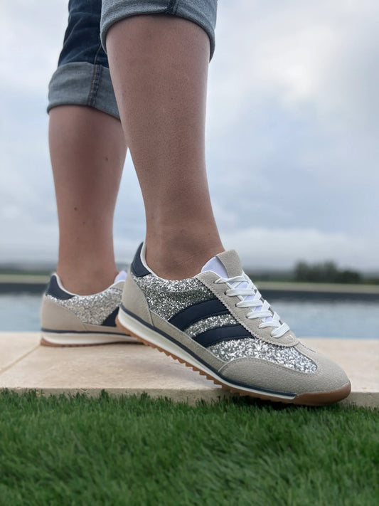 Chaussures baskets basses gris pailleté avec des rayures bleu marine style sneakers