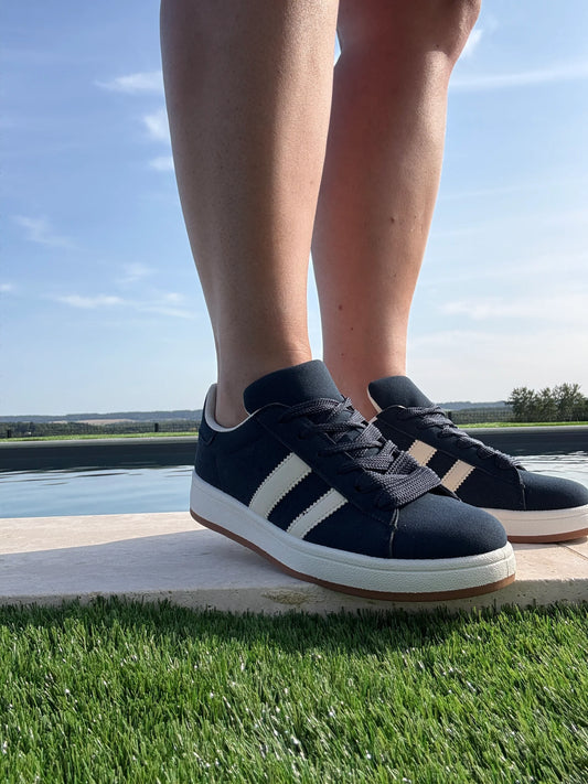 Chaussures baskets basses bleu marine blanc style campus