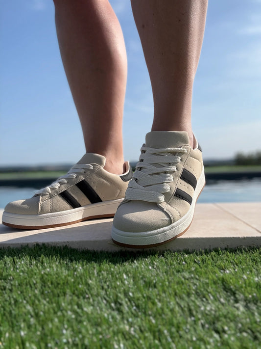 Chaussures baskets basses beige sable avec bandes noires style campus