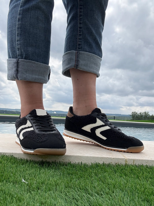 Chaussures baskets en moumoute bouclettes noires et blanches avec motif en zigzag
