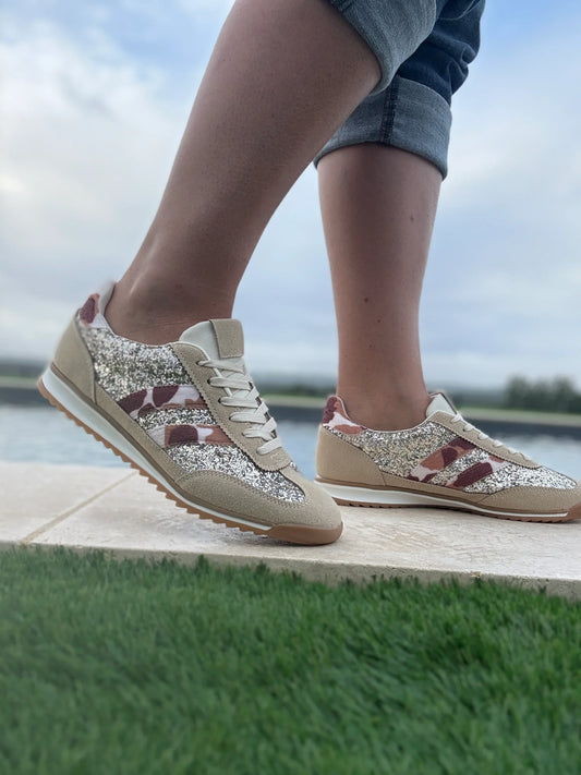 Chaussures baskets basses gris pailleté avec des rayures motif léopard style sneakers