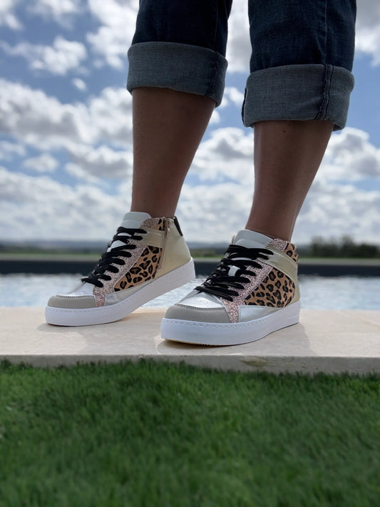 Chaussures baskets hautes type sneakers montantes léopard et doré