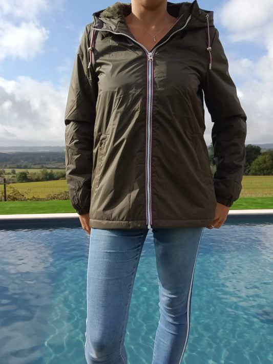 Laura Jo - Imperméable mi long doublé en fausse fourrure cordons tricolores couleur kaki