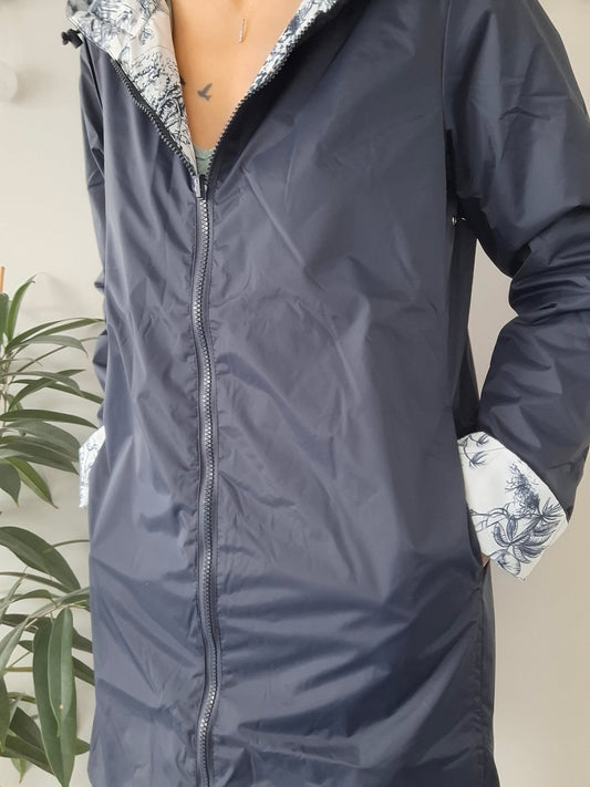Laura Jo - Imperméable bleu marine réversible motif jungle long mi-saison garnissage ouate