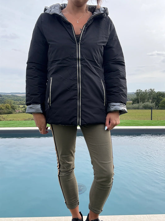 Melya Melody - Manteau court noir réversible et imperméable matelassé argenté brillant