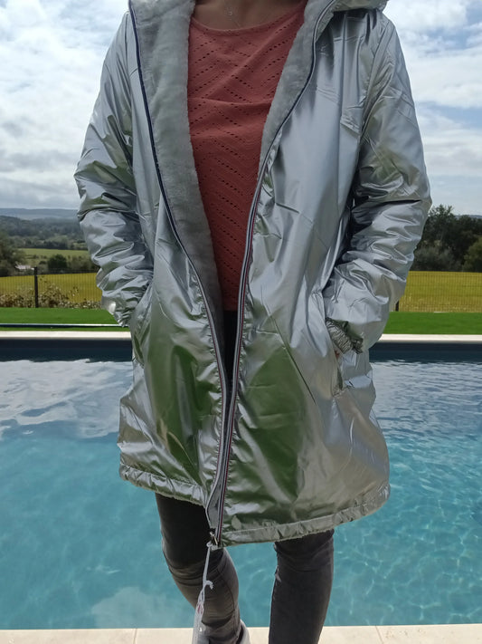 New Lolo - Manteau long argenté réversible imperméable fourré fausse fourrure